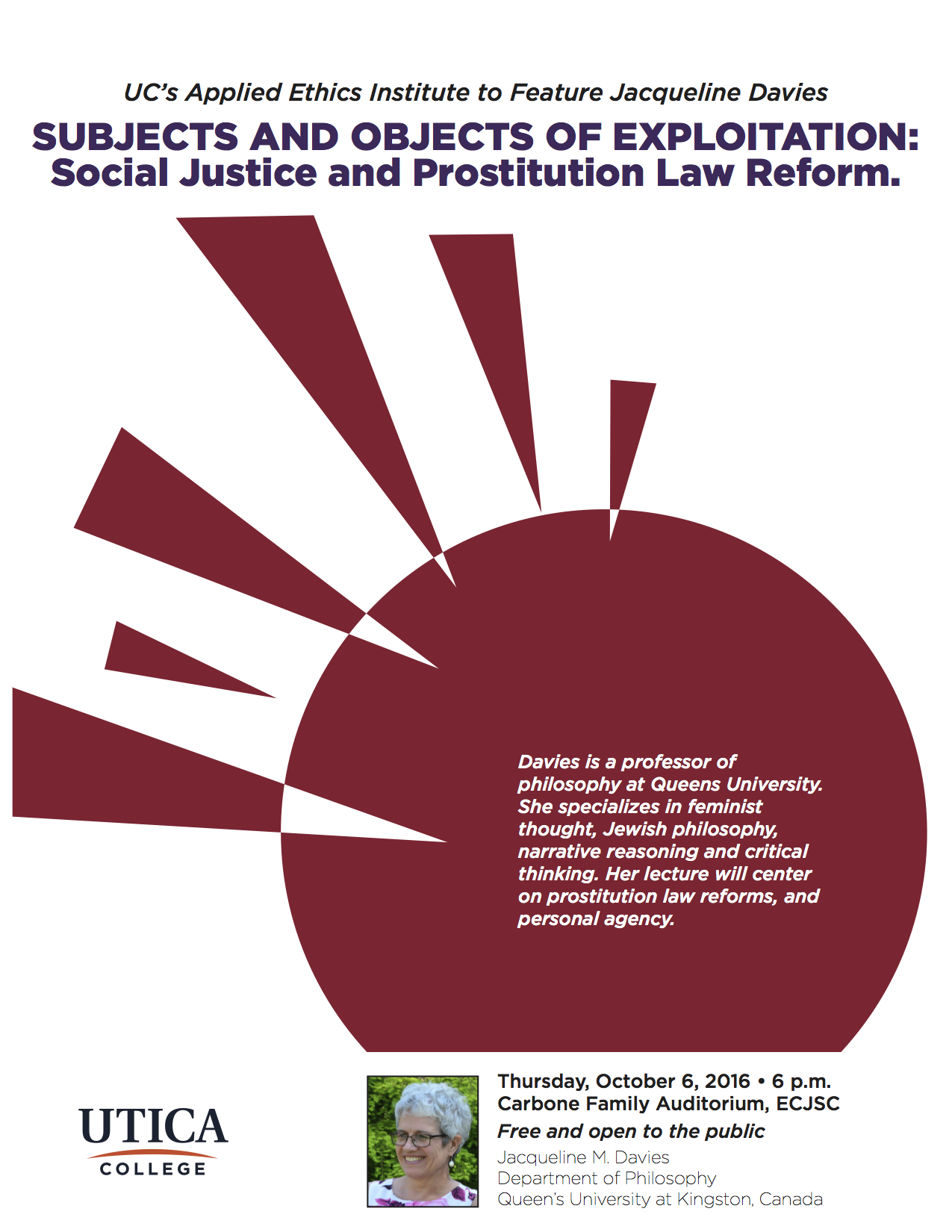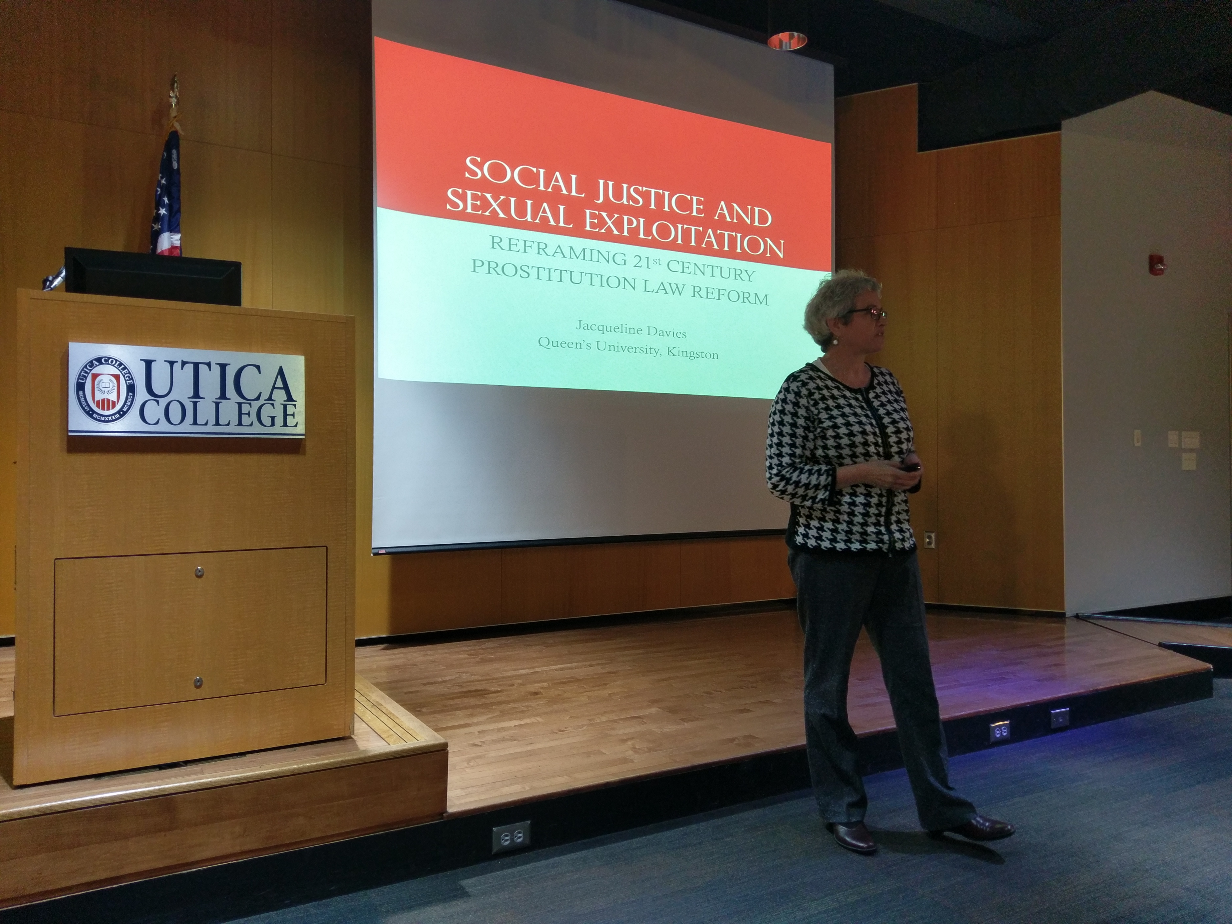 At 6:00 pm on Thursday, October 6, 2016, Professor Jacqueline Davies gave a public lecture titled "Subjects and Objects of Exploitation: Social Justice and Prostitution Law Reform". The talk was hosted in Carbone Auditorium on Utica College's campus at 1600 Burrstone Rd., Utica, NY.Professor Davies discussed prostitution law reforms, originating in Sweden, that have recently been enacted in Canada and are currently under discussion in the U.S. She elaborated on the “two-pronged approach” that is being used in these cases, which portrays buyers of sex as criminals and those who are paid for sex as victims. She argued that concern for victims is generally a good thing, except that in criminal cases, especially those with a sexual component, legislators and law enforcement treat victims as objects of exploitation. As objects of exploitation they are useful to the state as evidence of wrongdoing. Their status as legal and political subjects, however, is compromised. She claimed that the Nordic model and its supporters, wittingly or not, undermine the subject perspectives of those who are the objects of their concern.
