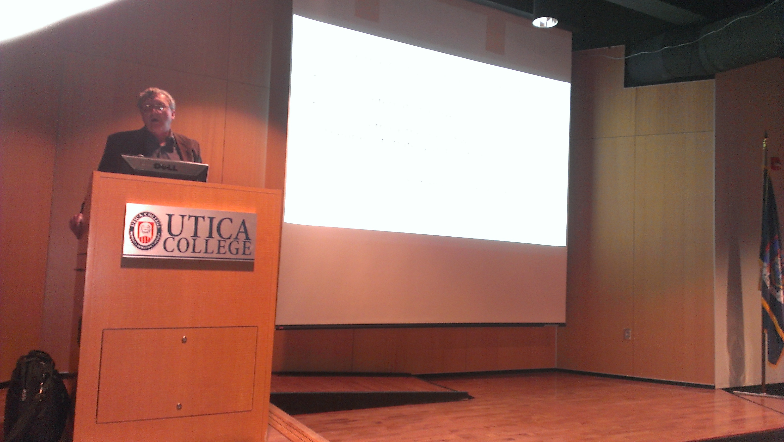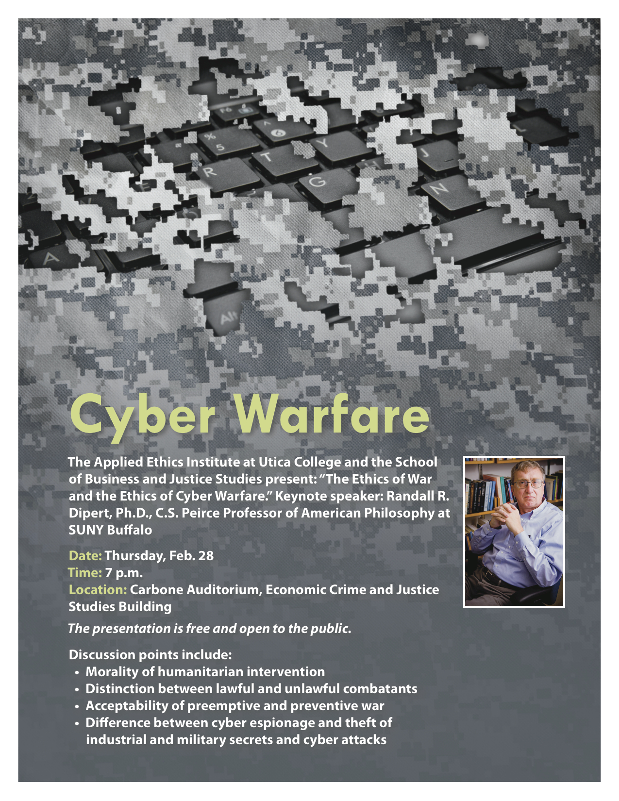 At 7:00 pm on Thursday, February 28, 2013, Professor Randall Dipert, C.S. Peirce Professor of American Philosophy, SUNY Buffalo, gave a public lecture titled "The Ethics of War and the Ethics of Cyberwar". The talk was hosted in the ECJS Carbone Auditorium on Utica College's campus at 1600 Burrstone Rd., Utica, NY.