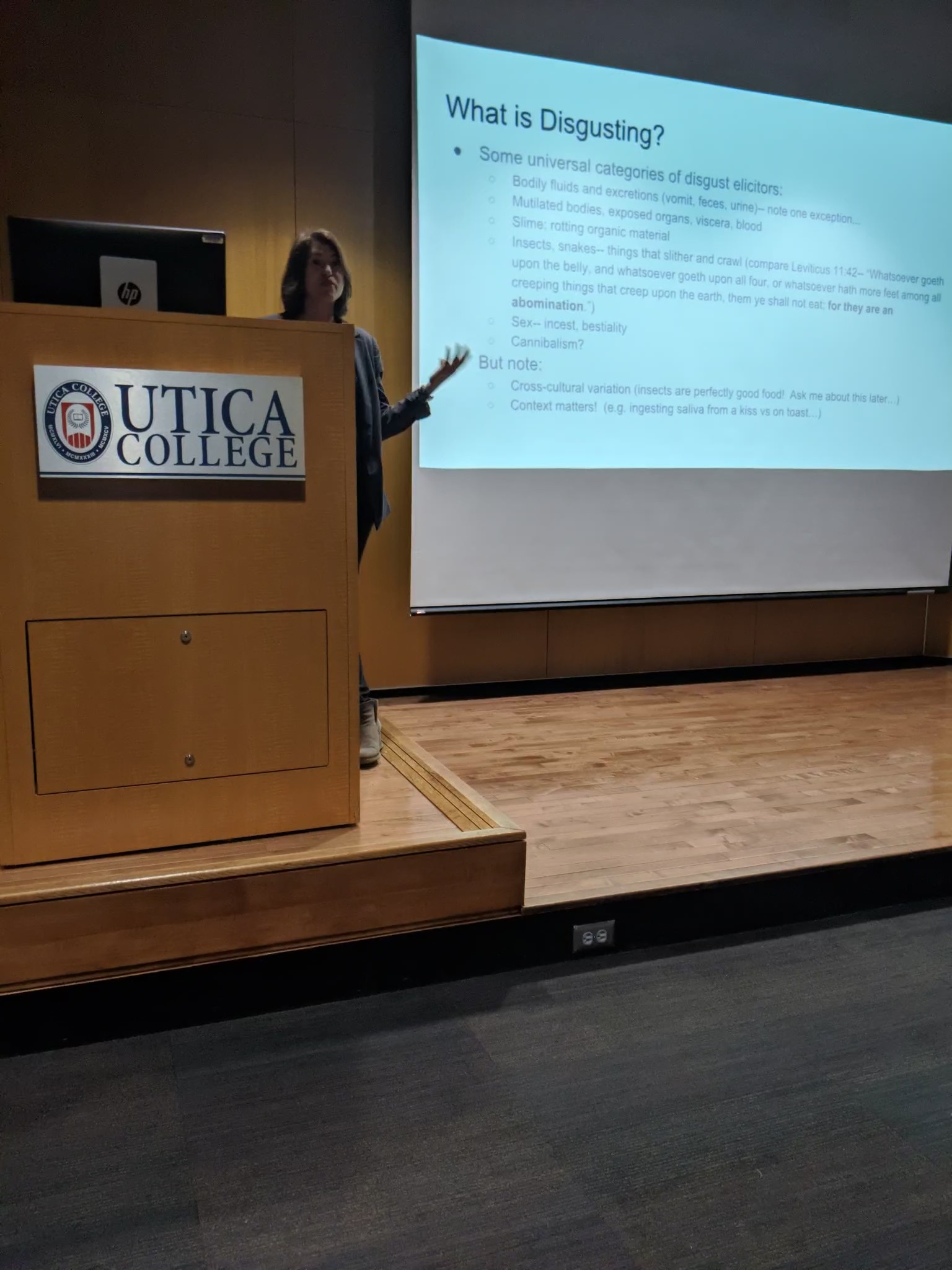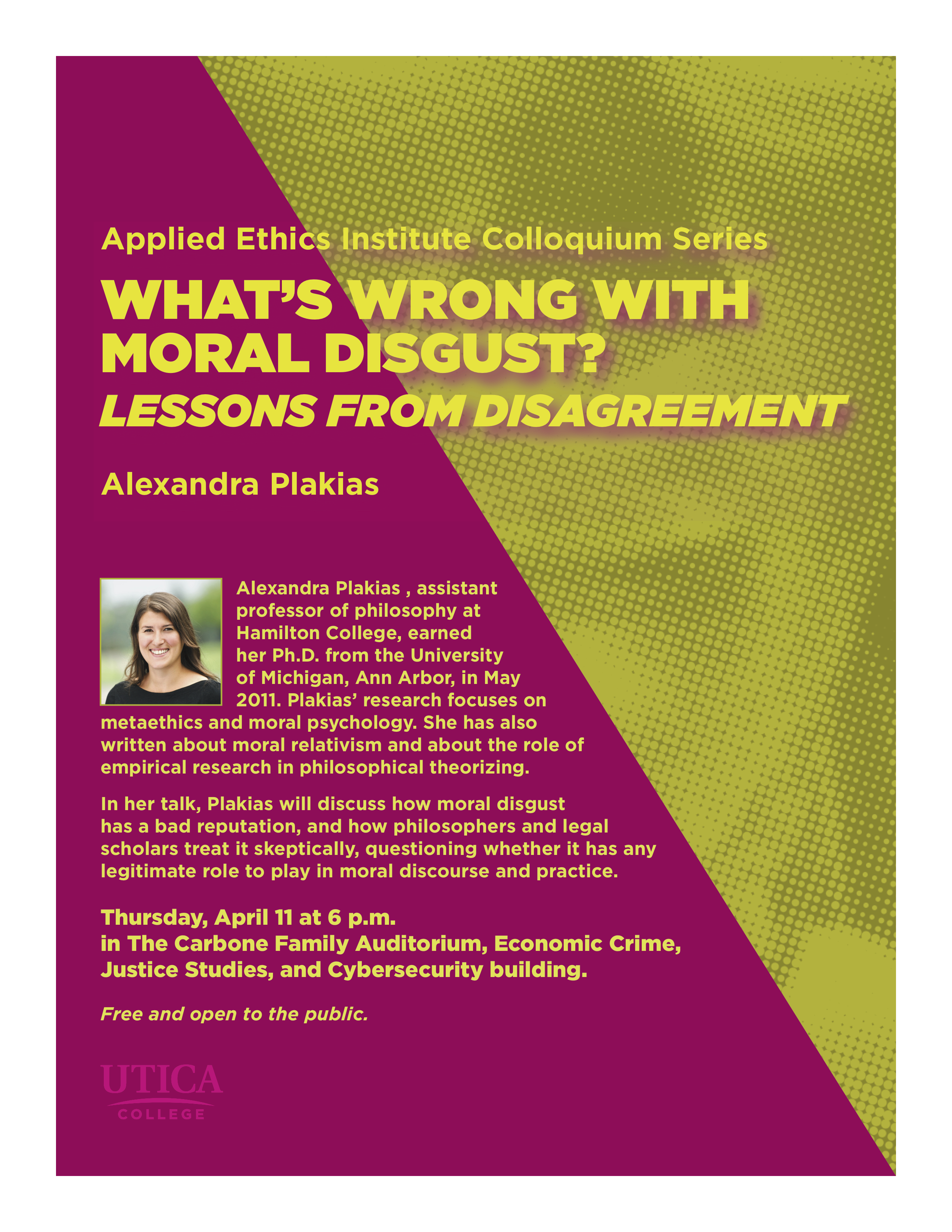 At 6:00 pm on Thursday, April 11, 2019, Professor Alexandra Plakias gave a public lecture titled "What's Wrong with Moral Disgust? Lessons from Disagreement". The talk was hosted hosted in Carbone Auditorium on Utica College's campus at 1600 Burrstone Rd., Utica, NY. Professor Plakias observed how moral disgust has a bad reputation: philosophers and legal scholars treat it skeptically, questioning whether it has any legitimate role to play in moral discourse and practice. In this talk, she surveyed some of the most prominent reasons for rejecting moral disgust and argue that none stands up to scrutiny. She offered an alternative diagnosis of our discomfort with disgust, one that draws on its role in moral disagreements. On this account, the problem of disgust in the moral domain has to do with the way it entrenches disagreements and distances disputants, acting as a barrier to moral convergence.