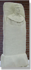 -- This plaster model of the artist's concept of "The Pioneer." When the actual carving began, DiSpirito decided to make "The Pioneer" more rugged, so he made him without the coonskin hat and eliminated the log cabin in the background.
